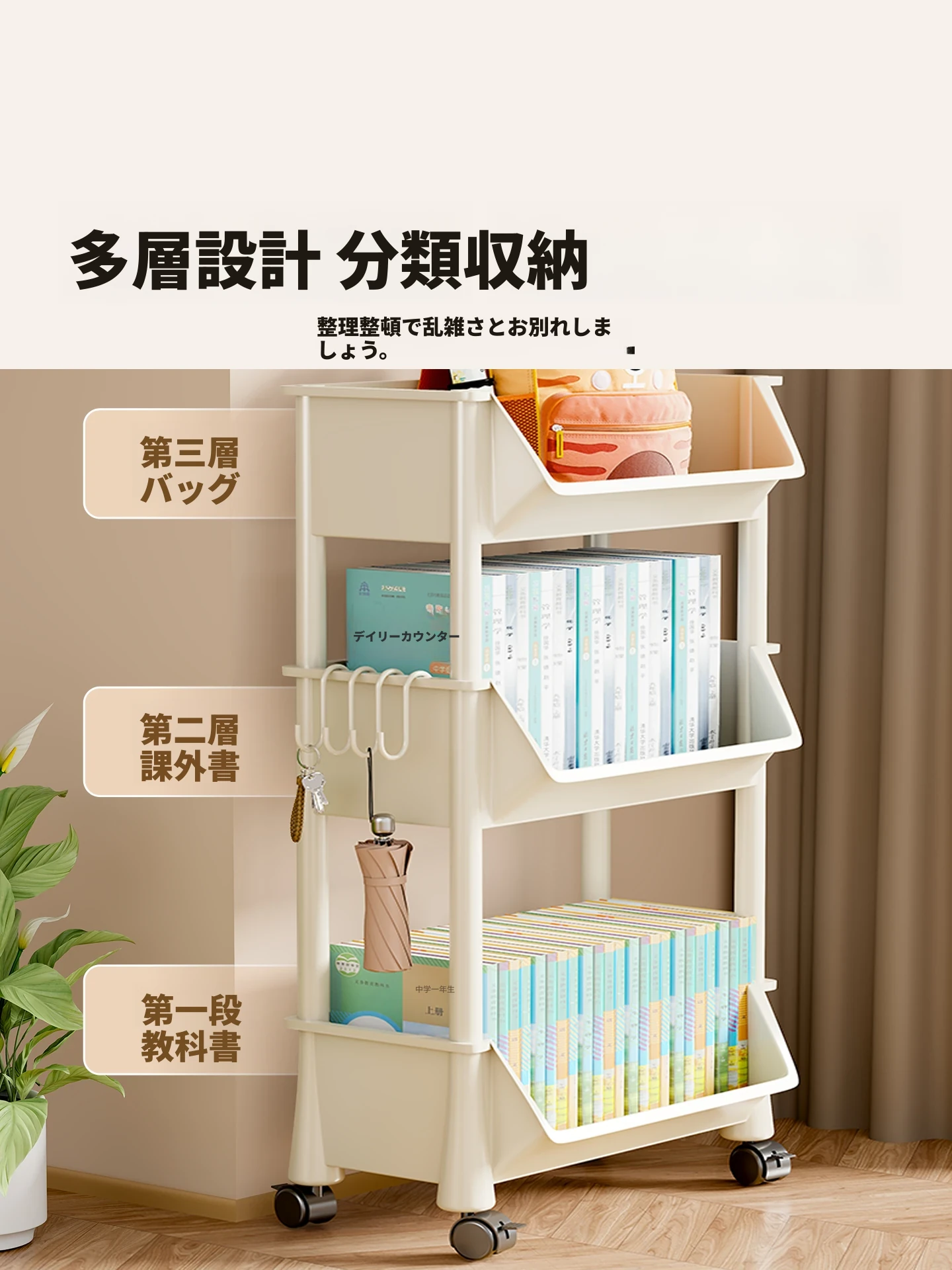 移動式ブックシェルフ・収納カート - 書斎やデスクの横に最適!本やバッグをスッキリ収納できるマルチファンクションデザイン。学生や家庭にぴったりのスペース節約アイテム!