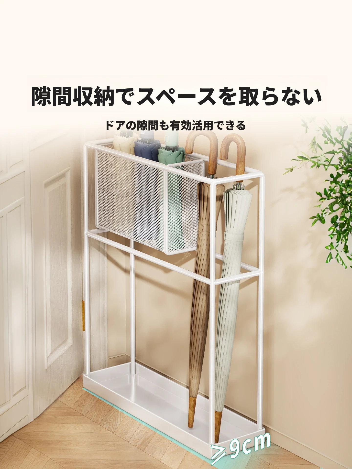 家庭用雨伞スタンド - 玄関の隙間にぴったり!商用にも最適なアイアン製の水切り付き収納ラック。おしゃれで便利な傘立てで、すっきりとした玄関を実現!