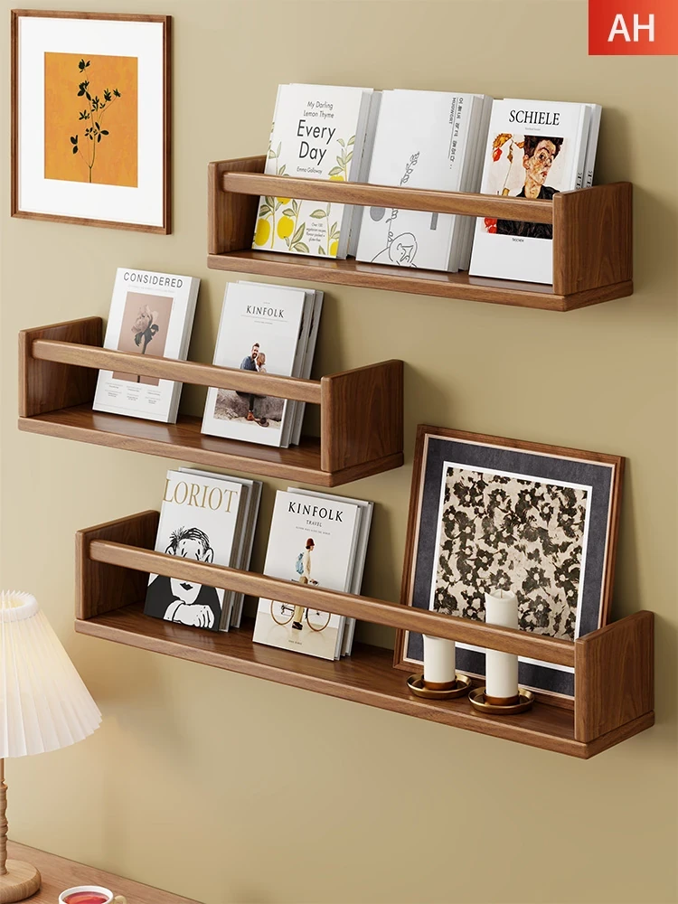 穴あけ不要の実木製壁掛け棚 - リビングルームのテレビ壁面を美しく飾るシンプルでスタイリッシュなディスプレイシェルフ!おしゃれな一文字型の仕切りで、収納とインテリアを両立!