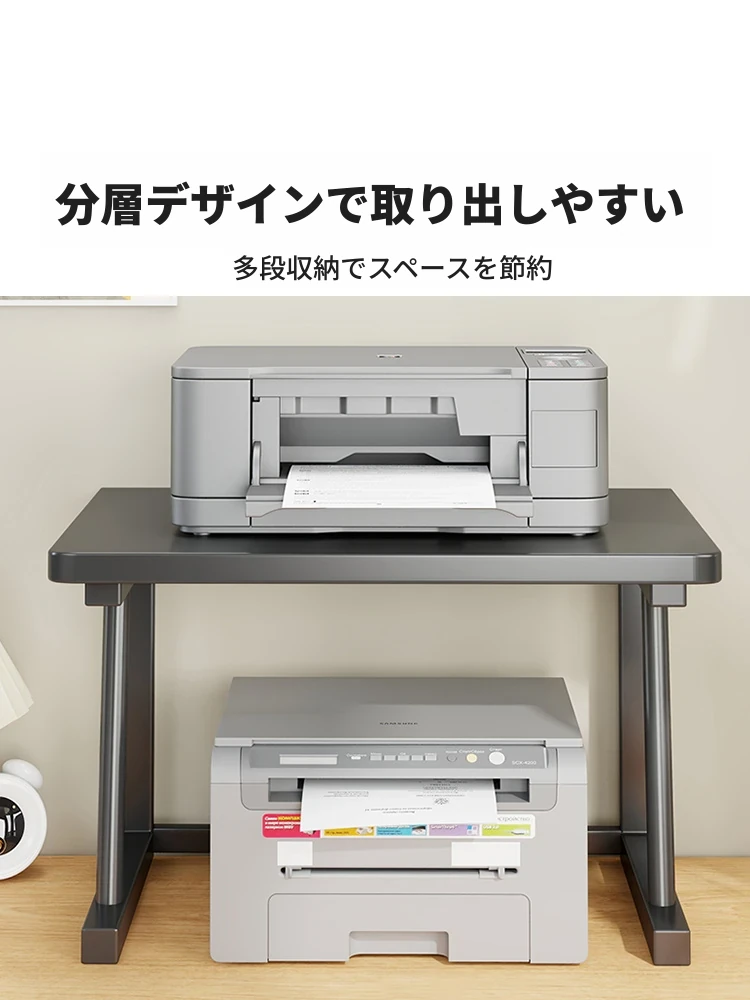 デスク上のスリムな二段ファイル収納棚 - オフィス用小型コピー機スタンドで、デスクをすっきり整理!効率的なスペース活用とスタイリッシュなデザインで、仕事も快適に。