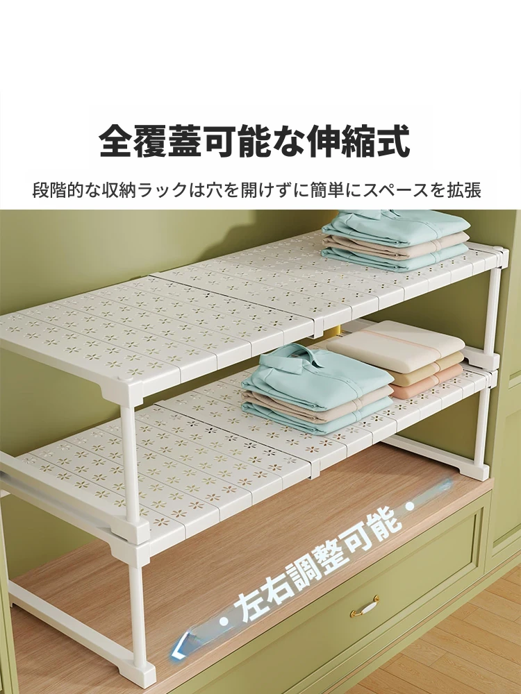 伸縮可能な衣類収納棚!クローゼットや靴箱に最適な多層設計。家中どこでも使える、重ねてスペースを有効活用できる便利なアイテムです。整理整頓が簡単に!