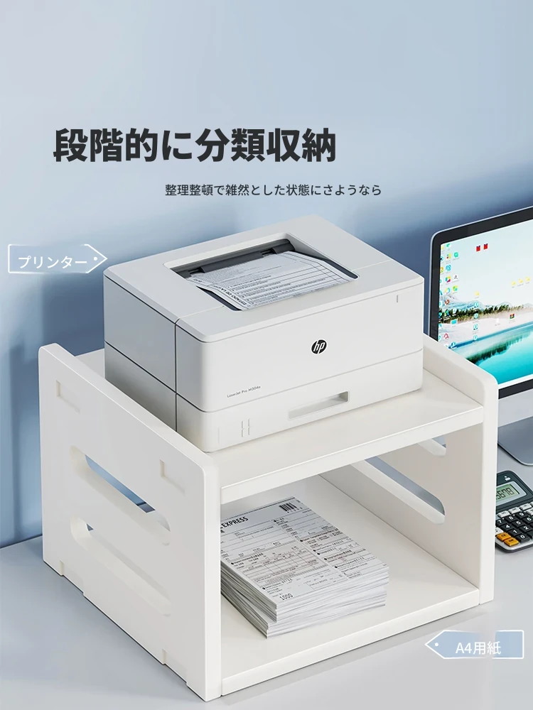 デスクトップ用二段式プリンターラック - 多機能収納でオフィスをすっきり!コピー機や小物をスマートに整理整頓!あなたの作業スペースを快適に整えます。