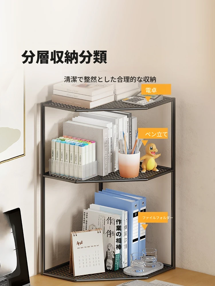デスク用三角形シェルフ - コンパクトなコーナー収納、スタイリッシュなデザインでデスク周りをスッキリ整理!オフィスや勉強スペースにぴったりな小型扇形書棚。