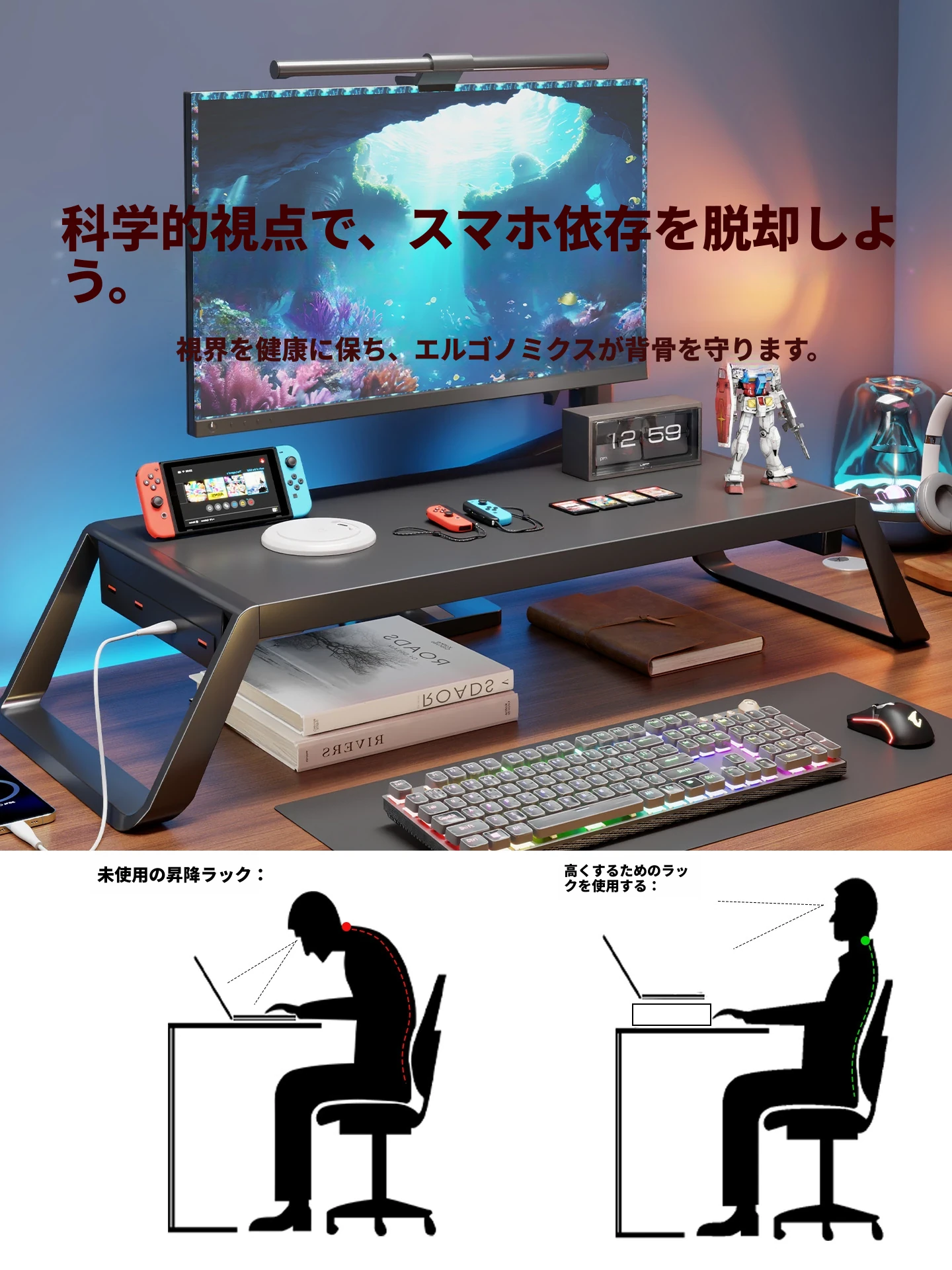 ゲーミングデスクに最適!デスクトップパソコン用昇降スタンド、USBポート付きディスプレイモニタースタンド。家庭用ノートパソコンにも対応、収納スペースも充実!快適な作業環境を実現します。